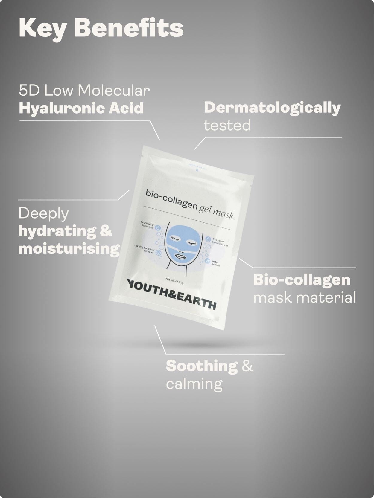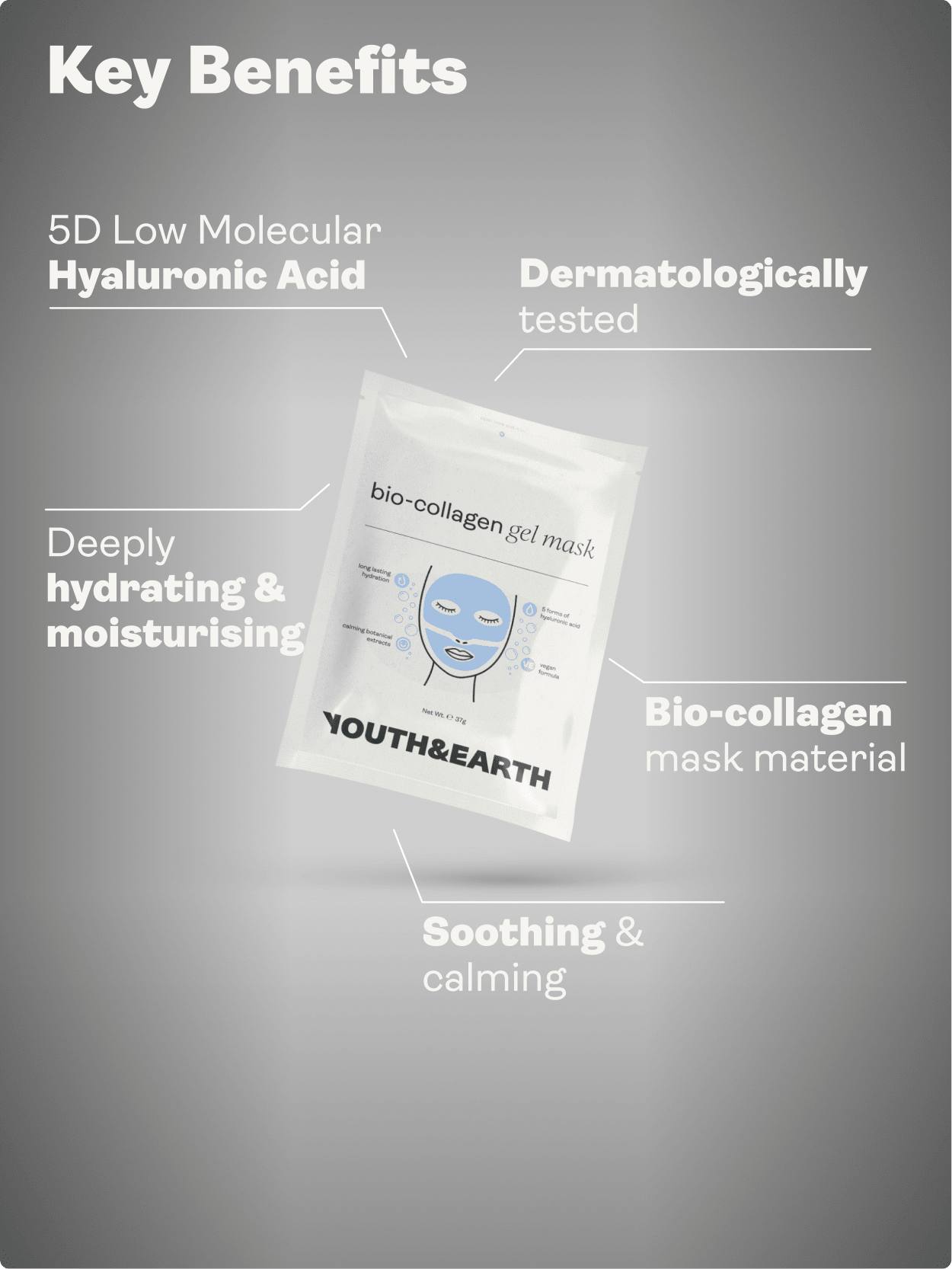 Indulge your skin with the luxurious 5D Low Molecular Hyaluronic Acid Bio-Collagen Gel Face Mask by Youth & Earth. Our vegan, dermatologically tested, Korean-skincare inspired mask was meticulously formulated to provide unparalleled hydration, soothing care, and anti-ageing benefits...