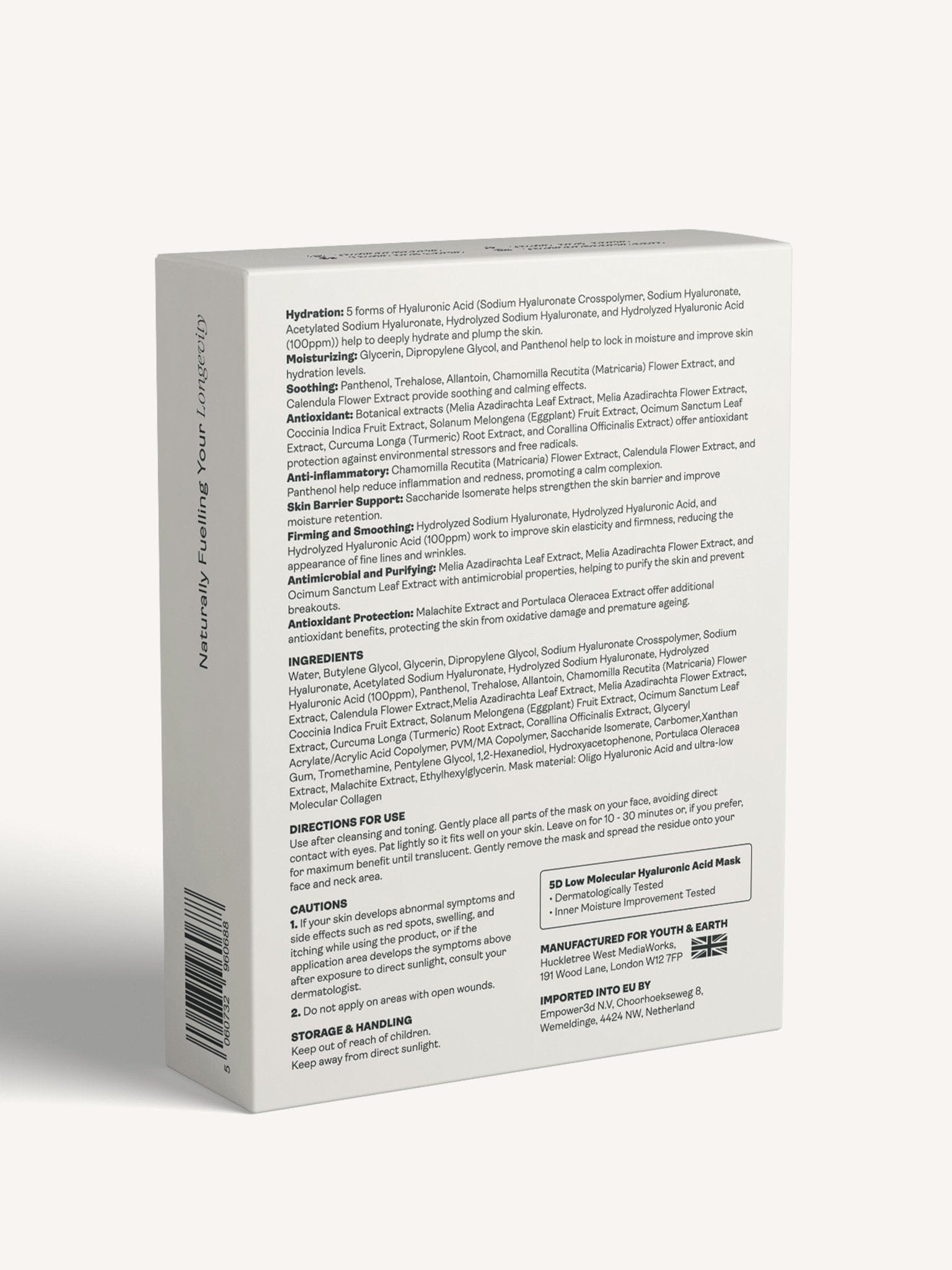 Dopřejte své pleti luxusní gelovou pleťovou masku s nízkomolekulární kyselinou hyaluronovou 5D od Youth & Earth. Naše veganská, dermatologicky testovaná maska inspirovaná korejskou péčí o pleť byla pečlivě vyvinuta tak, aby poskytovala jedinečnou hydrataci, zklidňující péči a účinky proti stárnutí. Je k dispozici ve výhodném balení po 5 kusech a poskytuje luxusní zážitek jako v lázních přímo u vás doma.