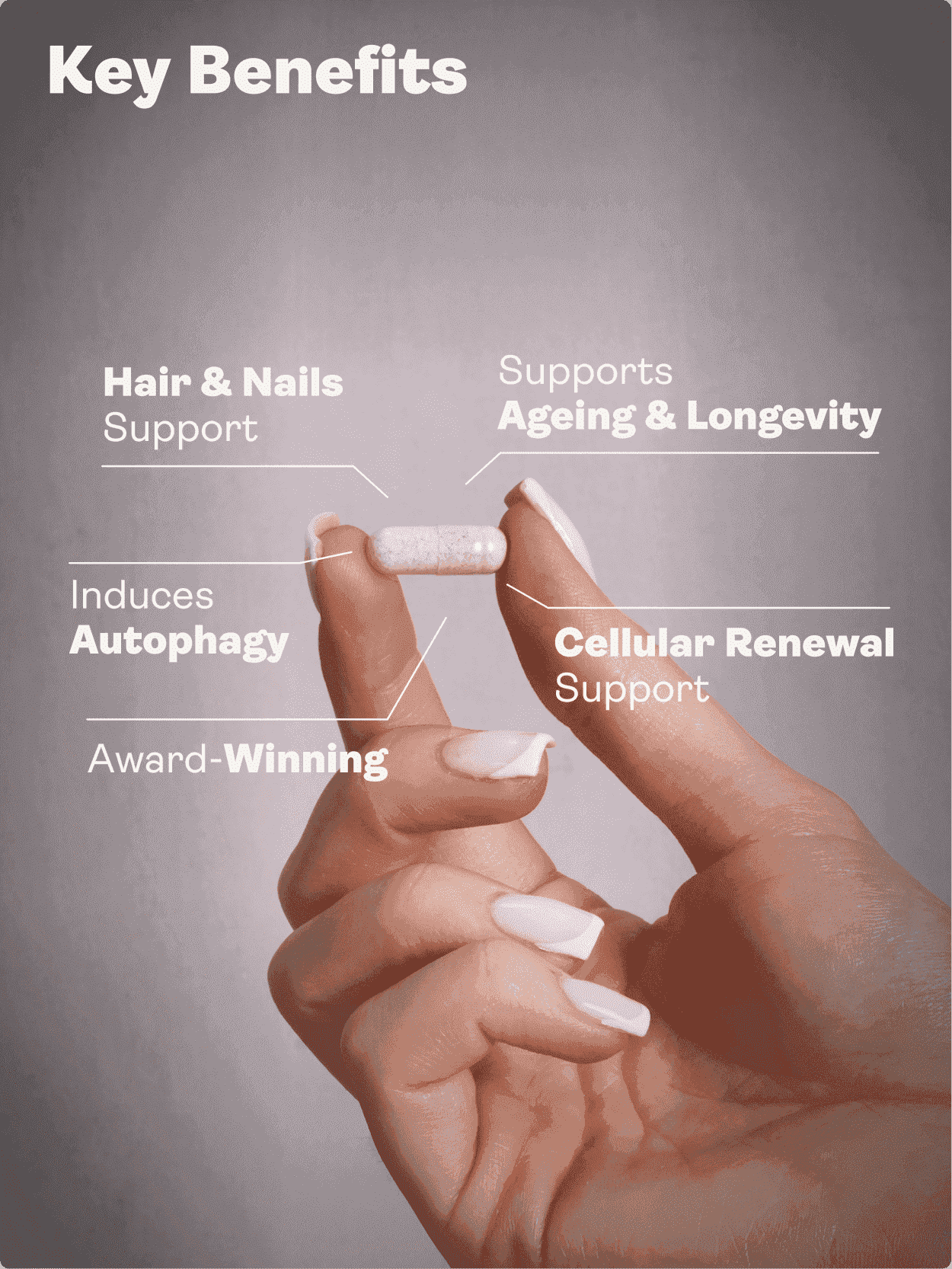 Spermidin také podporuje růst vlasů a nehtů tím, že podporuje buněčnou obnovu a zvyšuje schopnost těla opravovat a regenerovat buňky. Tento proces posiluje vlasové folikuly a nehtová lůžka, což vede ke zdravějším a silnějším vlasům a nehtům.