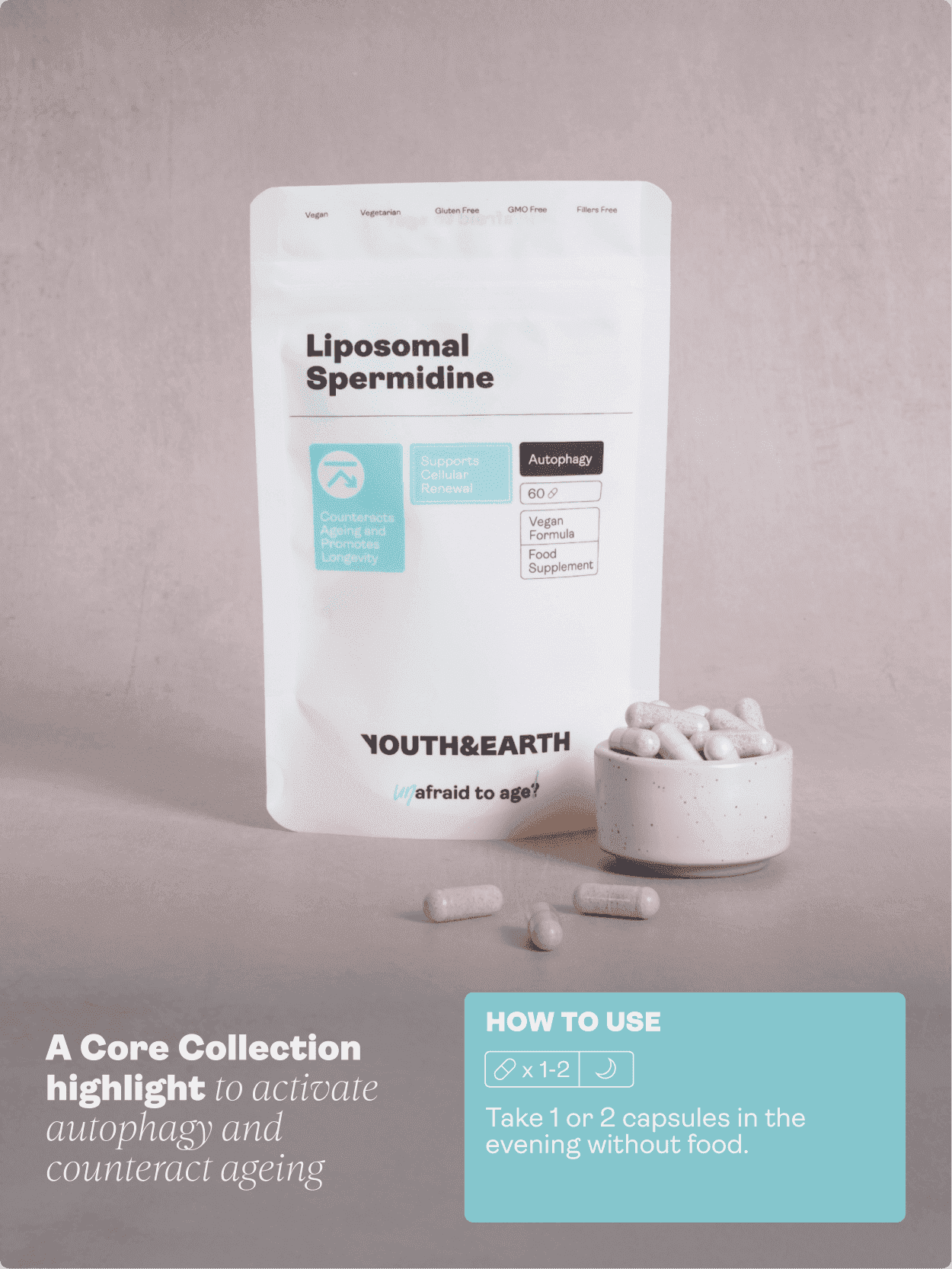 Náš oceňovaný spermidin je přírodní polyamin, který působí proti stárnutí a podporuje dlouhověkost tím, že aktivuje autofagii, proces obnovy a recyklace buněk v těle.