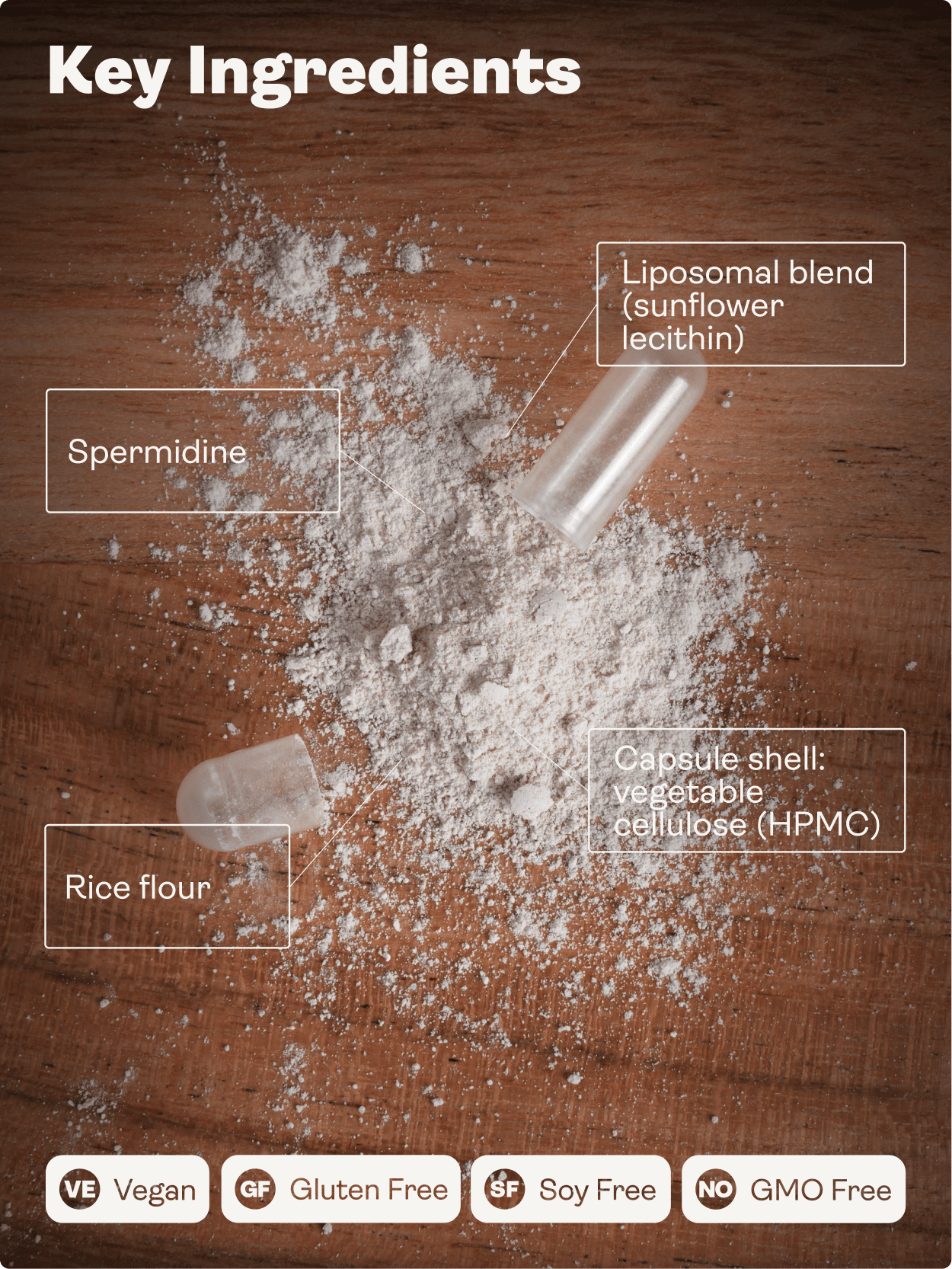 Složení : Liposomální směs (slunečnicový lecitin), spermidin, rýžová mouka, obal kapsle: Složení: rostlinná celulóza (HPMC).
