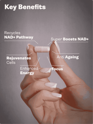 Kromě viditelných výhod může podpora vyšší hladiny NAD+ přispět k celkovému pocitu vitality. Zvýšením produkce buněčné energie může NAD+ přispět ke snížení únavy, podpořit lepší kvalitu spánku a podpořit energičtější a vyváženější stav pohody. Když vaše buňky fungují co nejlépe, často se to projeví - přirozenou září, lepší náladou a druhem energie, která vyzařuje zevnitř ven.