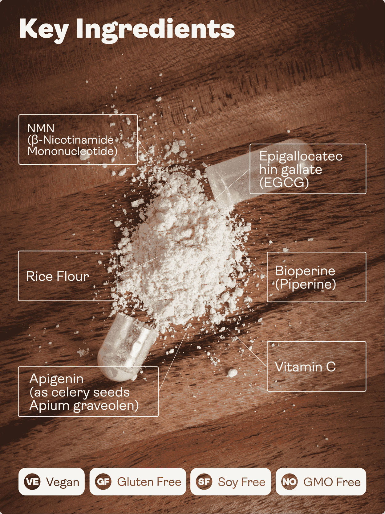 Složení : NMN (nikotinamid mononukleotid), epigalokatechin galát (EGCG), apigenin (jako semena celeru Apium graveolen), vitamin C, bioperin (piperin), rýžová mouka, obal kapsle: Složení: rostlinná celulóza (HPMC)