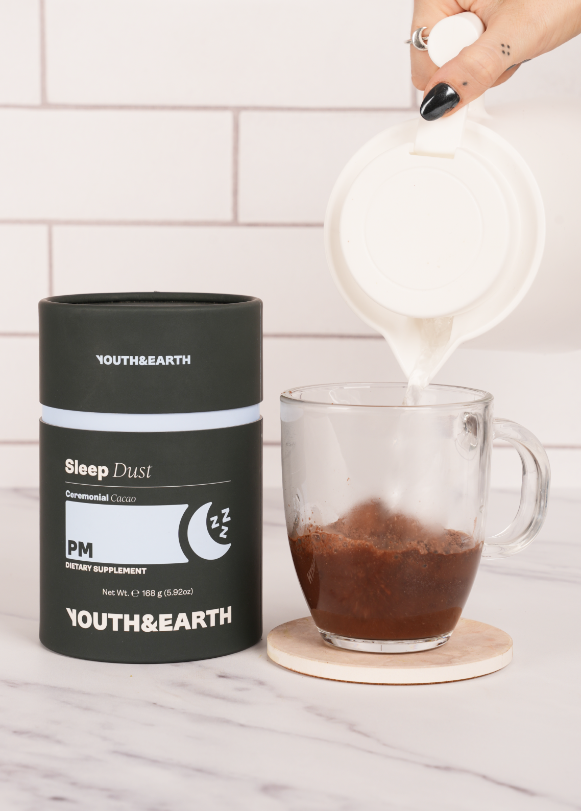 Pro dokonalé zklidnění smíchejte PM: Spánkový prach do horké vody pro uklidňující, bohatý nápoj, který chutná jako požitkářský šálek obřadního kakaa. Pokud dáváte přednost něčemu krémovějšímu, jednoduše přidejte své oblíbené mléko (kokosové nebo ovesné by chutnalo skvěle!) - promění se v lahodně hladkou pochoutku podobnou horké čokoládě, která je jako hřejivé objetí na konci dne. Skvěle se hodí k popíjení při večerním odpočinku, je to noční rituál, na který se budete těšit. Nejlépe si ho vychutnáte asi 30 minut před spaním, abyste se mohli plně uvolnit a uvolněně usnout.