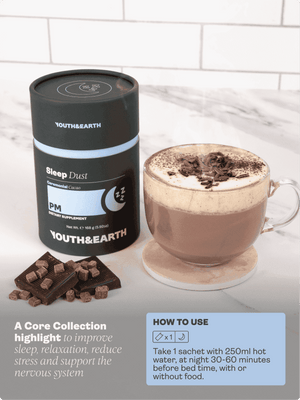 Pro skutečně uklidňující zážitek smíchejte 1 sáček PM Sleep Dust s 250 ml horké vody a připravte si bohatý, uklidňující nápoj s chutí obřadního kakaa. Pokud dáváte přednost krémovější variantě, stačí přidat oblíbené mléko, například kokosové nebo ovesné - promění se v hladkou pochoutku podobnou horké čokoládě, než se ponoříte do klidného spánku. Vychutnejte si ji 30-60 minut před spaním, abyste se plně uvolnili a připravili na klidný spánek.