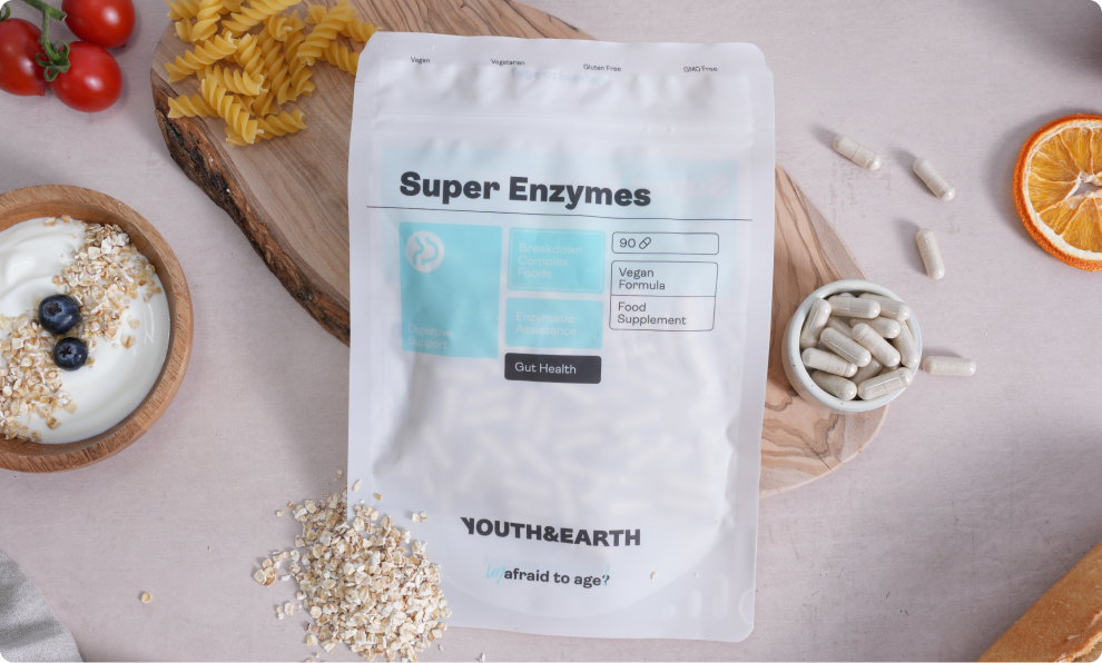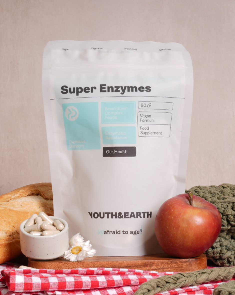 Super Enzymes by Youth & Earth are a comprehensive blend of digestive enzymes designed to support your body's ability to break down and absorb nutrients from your food. By enhancing the digestion of carbohydrates, fats, proteins, and fibres, Super Enzymes help to