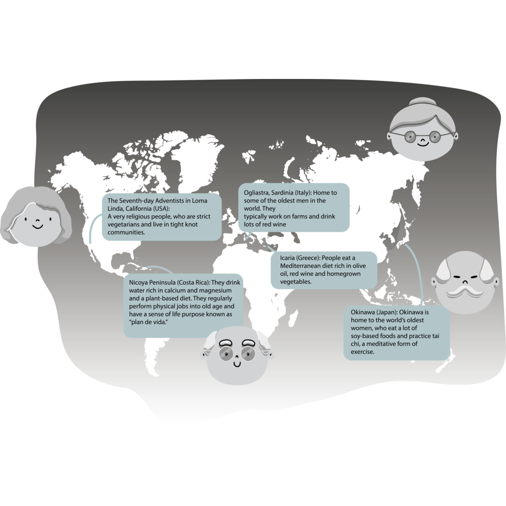 A number of studies have found that these areas contain extremely high rates of nonagenarians and centenarians, which are people who live over 90 and 100, respectively.
