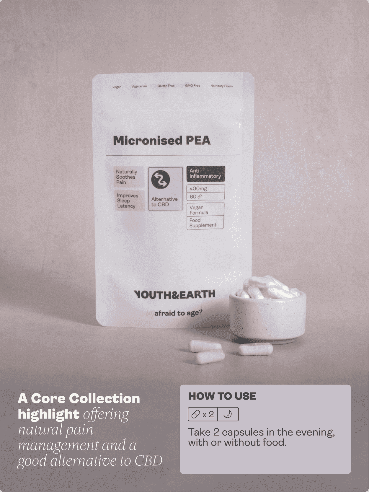 Naše PEA (palmitoylethanolamid ) nabízí přirozené řešení pro řízení bolesti, zánětu a a stres a podporuje přirozenou reakci vašeho těla na tyto problémy. Jako člen rozšířené skupiny endokanabinoidů se PEA přirozeně vytváří v těle a byl podrobně zkoumán pro své zdravotní účinky.
