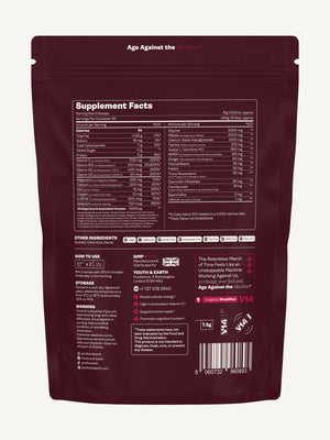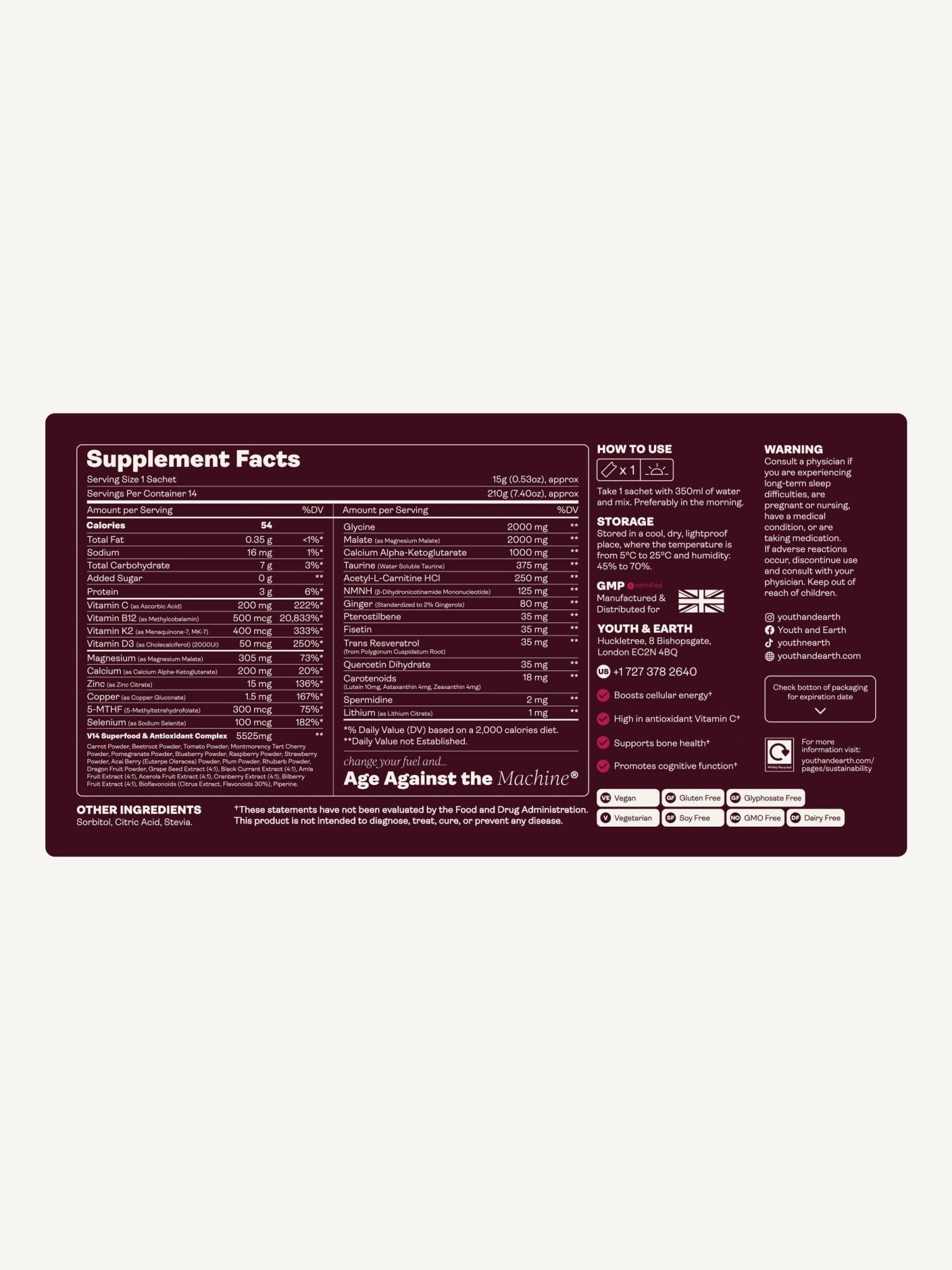 Složení : Glycin, malát hořečnatý, kalcium AKG (alfa-ketoglutarát), taurin, acetyl-L-karnitin HCI, NMNH (β-dihydronicotinamid mononukleotid), vitamin C (jako kyselina askorbová), zázvor, fisetin, pterostilben, kvercetin, trans-resveratrol, zinek (jako citrát zinečnatý), mikrodávka lithia, kartenoidy (lutein, astanxathin, zeaxantin), spermidin, měď (jako glukonát měďnatý), lithium (jako citrát lithný), B12 (jako methylkobalamin), vitamin K2 (jako menachinon-7, MK-7), 5-MTHF (5-Methyltetrahydrofolát), selen (jako seleničitan sodný), vitamin D3 (jako cholekalciferol), L-karnitin, mrkev v prášku, červená řepa v prášku, rajče v prášku, Prášek z třešní Montmorency, Prášek z granátového jablka, Prášek z borůvek, Prášek z malin, Prášek z jahod, Prášek z bobulí Acai, Prášek ze švestek, Prášek z rebarbory, Prášek z dračích plodů, Extrakt z hroznových jader (4:1), extrakt z černého rybízu (4:1), extrakt z plodů Amla (4:1), extrakt z plodů Acerola (4:1), extrakt z brusinek (4:1), extrakt z plodů borůvek (4:1), bioflavonoidy (extrakt z citrusů, flavonoidy 30 %), černý pepř (piperin), kyselina citronová, sorbitol, stévie.