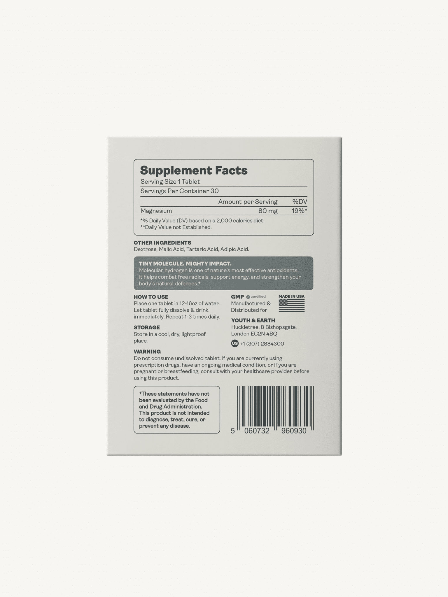 Die molekularen Wasserstofftabletten Youth & Earthsind ein wissenschaftlich fortschrittlicher Hydrationsverstärker, der Ihr Trinkwasser mit molekularem Wasserstoffgas (H₂) anreichert und so in Sekundenschnelle ein erfrischendes, antioxidantienreiches Getränk schafft. Geben Sie einfach eine Tablette ins Wasser und beobachten Sie, wie sie sprudelt und bei jedem Schluck Wasserstoffmoleküle freisetzt.