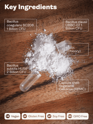 Our Spore probiotic supplement contains powerhouse probiotic strains, Bacillus subtilis HU58, Bacillus coagulans SC208, and Bacillus clausii