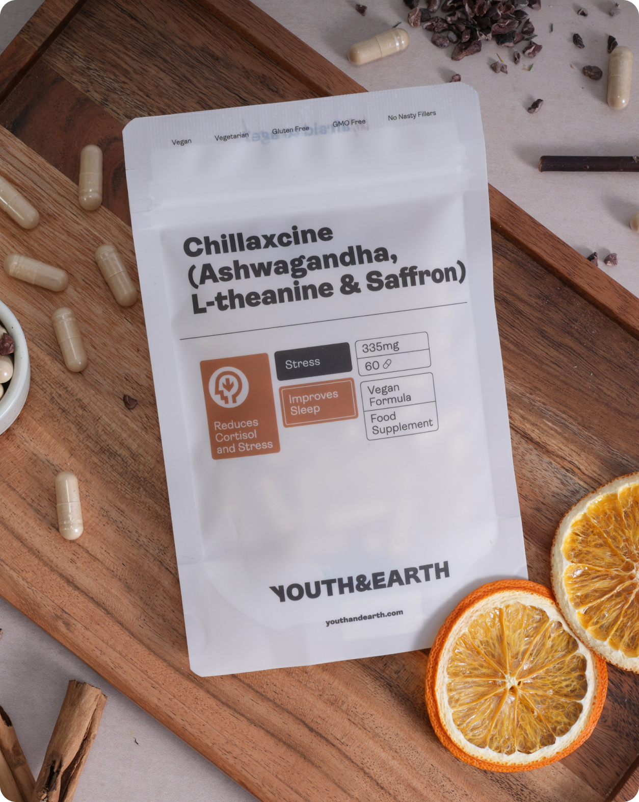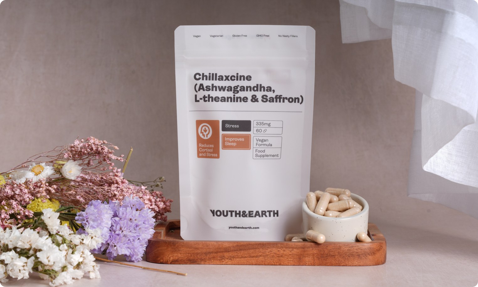 Chillaxine by Youth & Earth is an exlusive vegan-friendly stress-reducing supplement featuring highly bioavailable Shoden® Ashwagandha, L-theanine, and Affron® Saffron. It helps lower cortisol levels, provides anti-anxiety benefits, supports better sleep, balances metabolism, mood, and digestion, and fights free radicals with antioxidants.