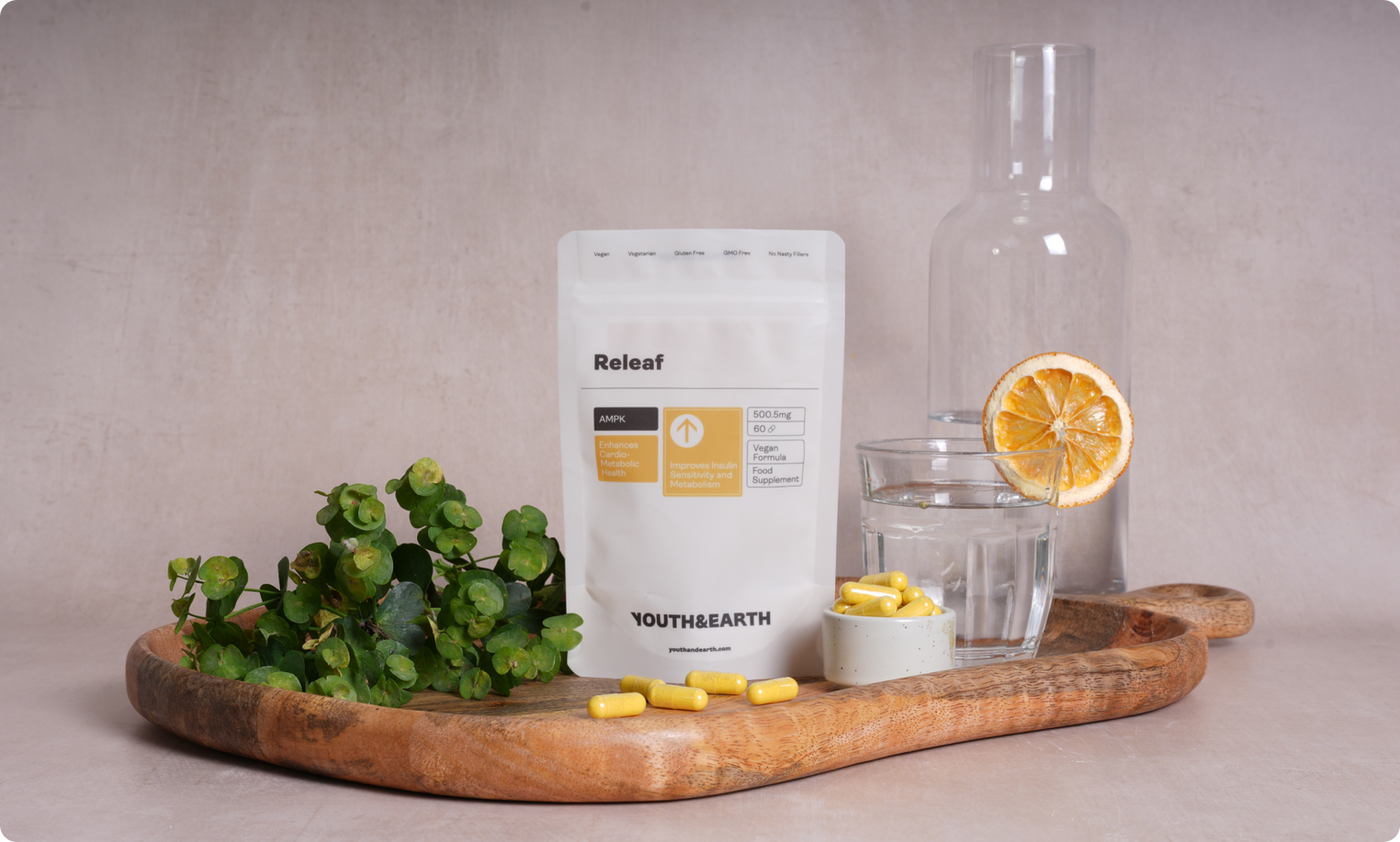 Releaf es una combinación exclusiva elaborada especialmente para Youth & Earth para apoyar el metabolismo y equilibrar los niveles de azúcar en sangre. Una rica fuente de berberina, que activa el gen de la longevidad AMPK - un componente clave de la regulación metabólica. Cuando se combina con silimarina, berberina también se ha demostrado para mejorar la salud cardiometabólica. Para apoyar el metabolismo y equilibrar los niveles de azúcar en la sangre, RELEAF también contiene Picolinato de Cromo altamente absorbible.