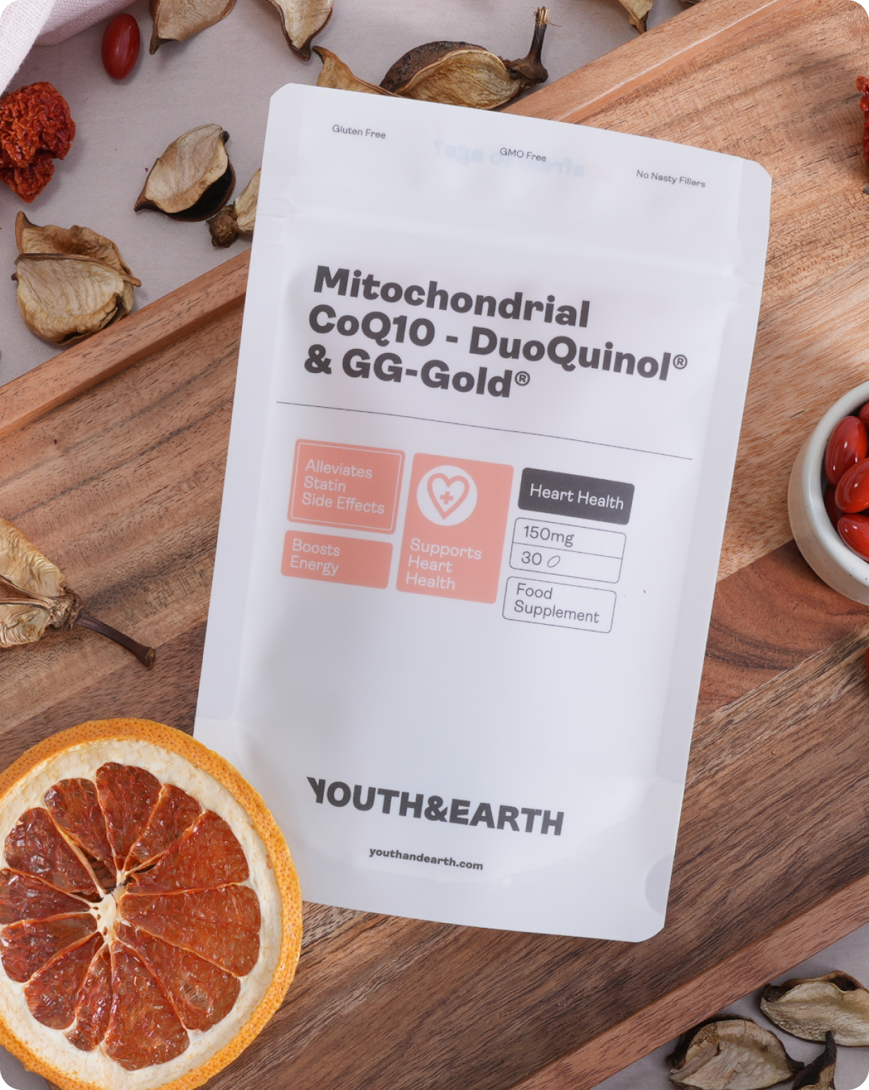 el suplemento Youth & Earth Mitochondrial CoQ10 combina DuoQuinol® (Ubiquinol, una forma activa de CoQ10) con GG-Gold® (Geranylgeraniol) para potenciar de forma natural la producción corporal de CoQ10 y GG. Esta combinación proporciona una potente protección antioxidante, favorece la energía celular y ayuda a combatir el envejecimiento. El ubiquinol ofrece una mayor biodisponibilidad y absorción en comparación con la ubiquinona, mientras que el GG potencia este efecto y favorece la función y la fuerza muscular.