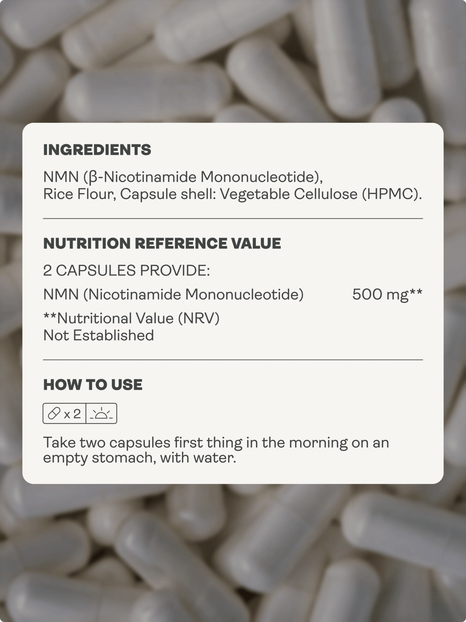 El NMN es un derivado de la vitamina B3 (niacina). Se produce de forma natural y puede obtenerse de fuentes dietéticas como la fruta, la leche y las verduras. En el cuerpo, NMN se utiliza para generar nicotinamida adenina dinucleótido (NAD +) - una de las moléculas más antiguas de la tierra que da poder a todas las células de nuestro cuerpo.