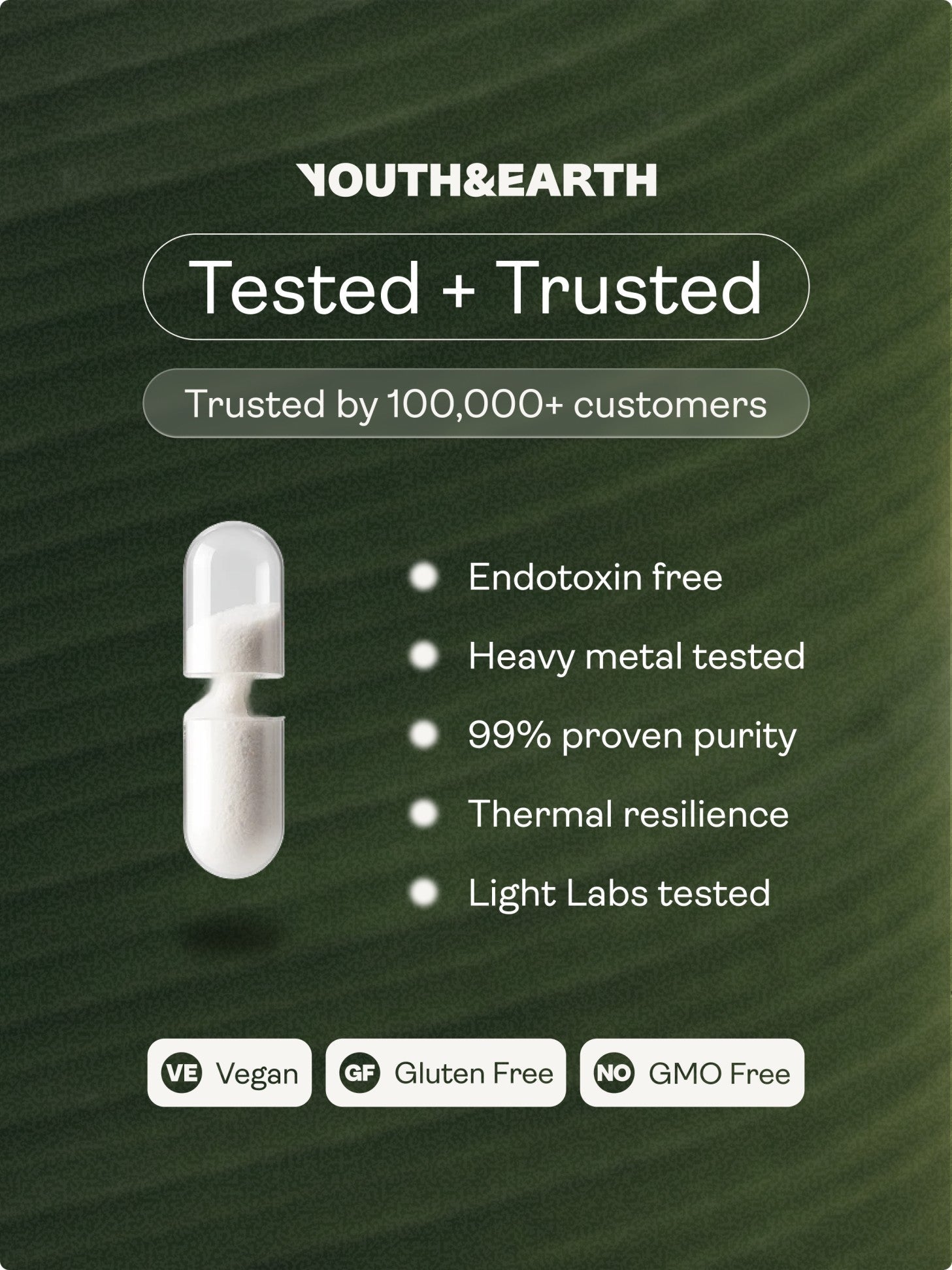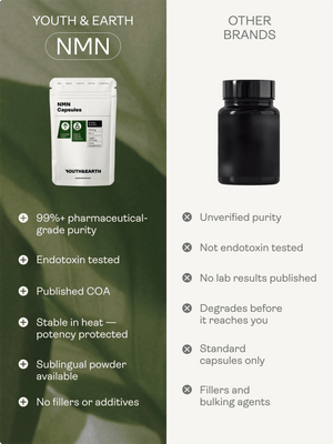 Las técnicas de producción de NMN pueden diferir enormemente. Sin embargo, en Youth & Earth podemos confirmar que nuestro NMN es estable a temperaturas extremas y ha sido probado hasta 40°C (104°F) y 75% de humedad relativa durante tres meses con poca o ninguna degradación de la pureza.