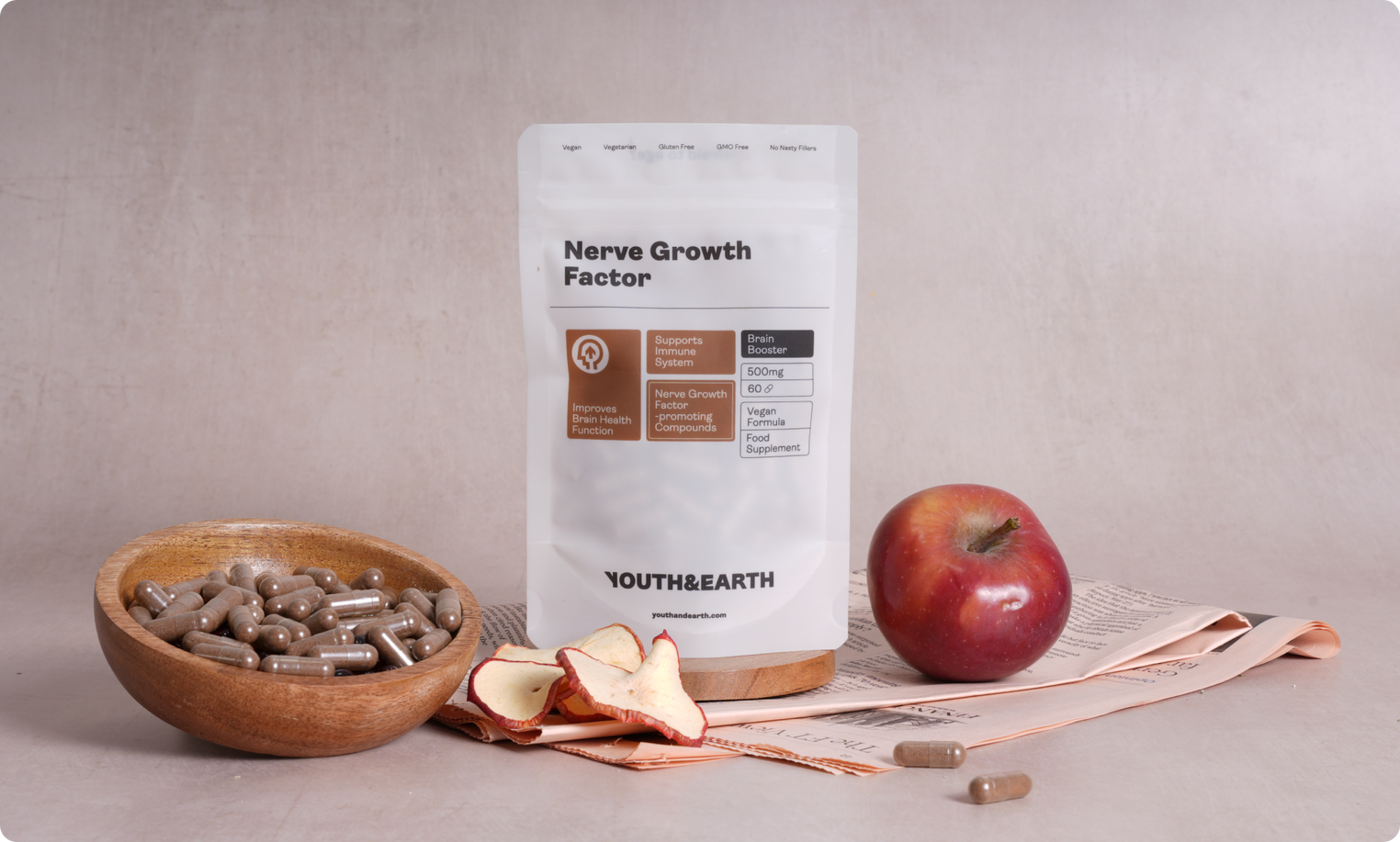 Ciò che distingue il Nerve Growth Factor di Youth & Earthè l'elevata potenza e la trasparenza della nostra formulazione. Ogni dose comprende i composti chiave del NGF: 1% di ericenoni e 4% di erinacine, che notoriamente attraversano la barriera emato-encefalica e sono quindi molto efficaci nel promuovere la crescita dei nervi e la salute del cervello. Inoltre, il nostro prodotto è stato testato per contenere oltre il 30% di beta-glucani, che supportano la salute immunitaria. A differenza di altri marchi tradizionali, mostriamo apertamente i risultati della concentrazione, indicando l'esatta potenza di questi composti sulla pagina del prodotto. Questa trasparenza e potenza garantiscono un integratore efficace e di alta qualità. Il nostro Fattore di Crescita Nervosa è anche vegano e senza glutine, privo di OGM, riempitivi e coloranti artificiali.